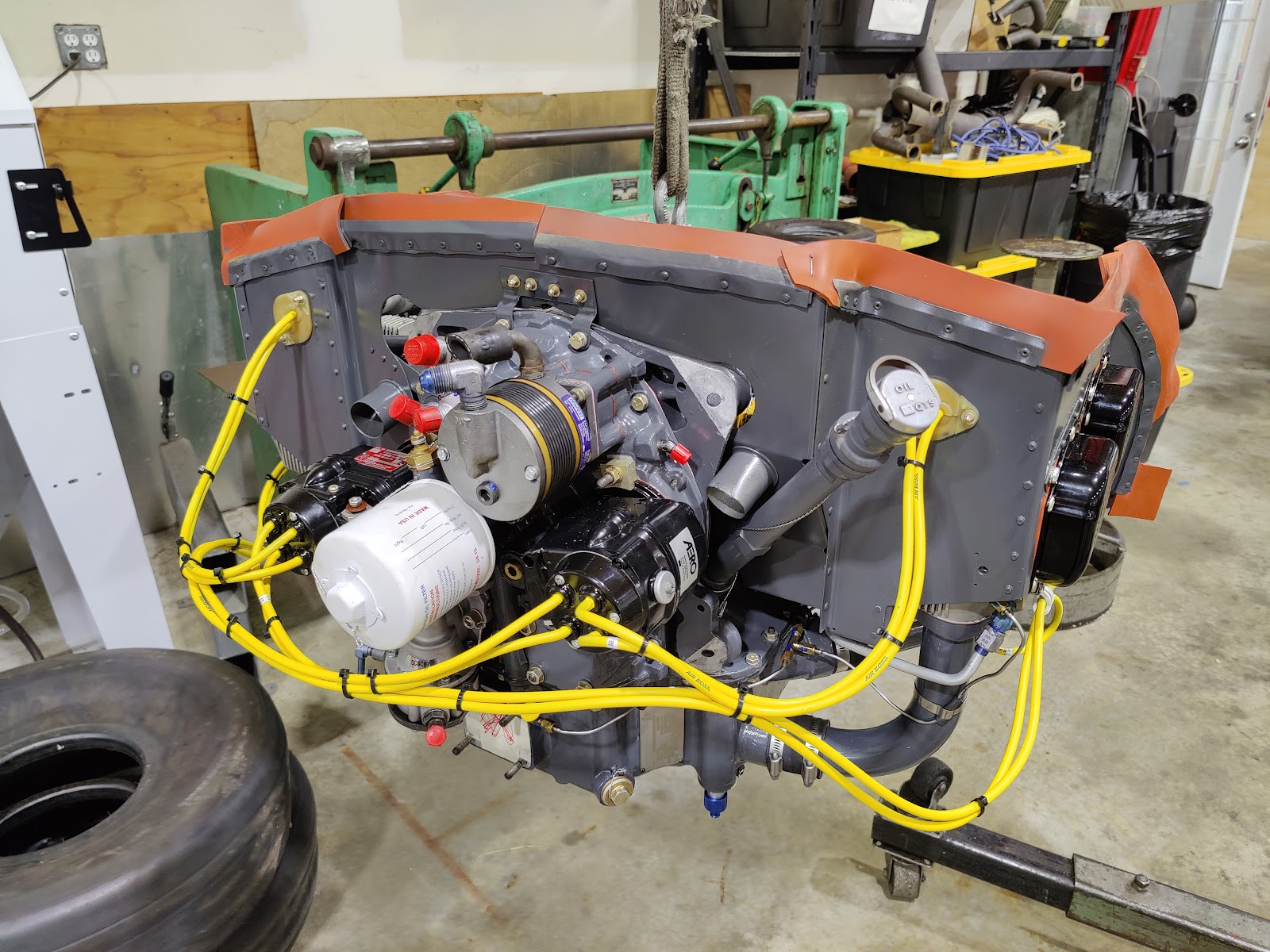 I went out to the shop today to take a few pictures of my engine and plane before the engine is remounted. The baffling and some other stuff has already been attached to the engine. The engine mount is not back yet. Since the nose gear is attached to the engine mount, the plane is currently sitting on the main gear, and a couple of supports just behind the firewall, and under the tail.